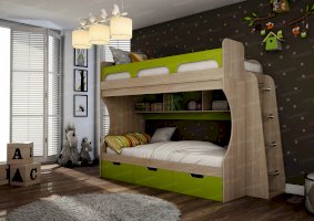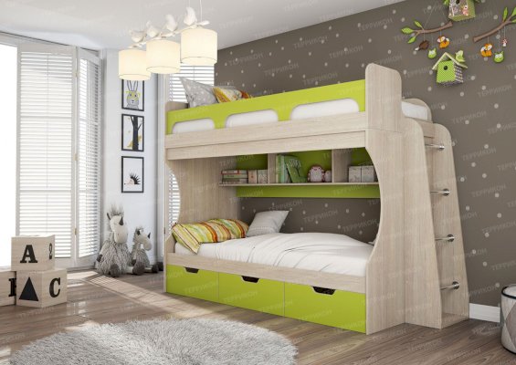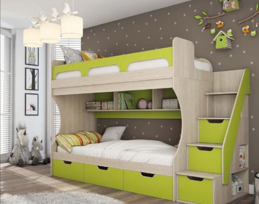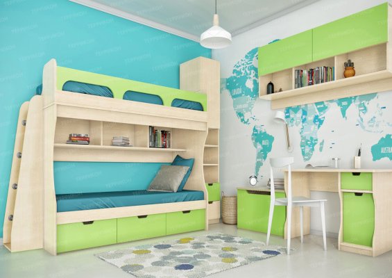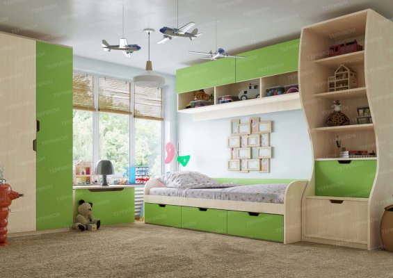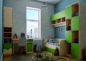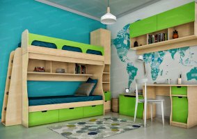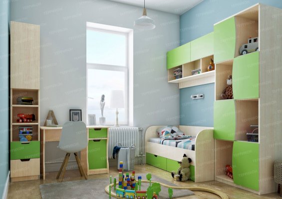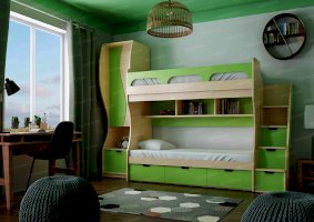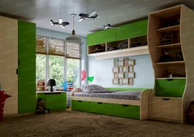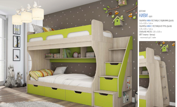 Атмосферу счастья и беззаботности приносит в дом детская «Киви». Сочетание оттенков лайм и дуб молочный выглядит очень жизнерадостно. Малышам нравится отдыхать и играть в такой комнате. Они с удовольствием спят на двух- или одноярусной кровати, хранят вещи в шкафу и на стеллажах, убирают игрушки в специальную тумбу и учат уроки за удобным письменным столом.