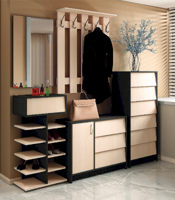 Интро - это целая серия мебели, с помощью которой вы можете обустроить прихожую. В серии представлены обувницы разных размеров с откидными створками, шкаф, зеркало, вешалки.
