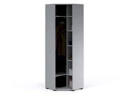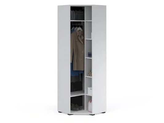 Угловой шкаф выполнен в современном стиле – сочетает в себе функциональность и эффектный внешний вид: строгая горизонтальная фрезеровка фасадов, ручки и задняя стенки контрастного черного цвета. Глянцевые белые фасады High Gloss из МДФ наполняют комнату светом, делают ее просторнее. Внутри предусмотрены секции для белья и отделение со штангой. Шкаф позволяет рационально использовать пространство и будет хорошо смотреться даже в небольшой комнате, служит связующим звеном для составления угловой системы хранения. Идеально компонуется со всеми модулями системы Йорк.