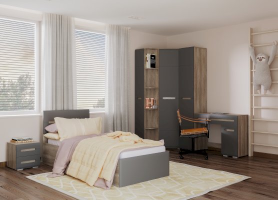 С умом использовать пространство поможет угловая модель шкафа Наоми из одноименной модульной серии. Изделие выполнено из ЛДСП, фасад распашной дверцы состоит из МДФ и имеет встроенную ручку. Внутри шкаф разделен на две зоны для размещения одежды на вешалках и хранения сложенных вещей на полках.